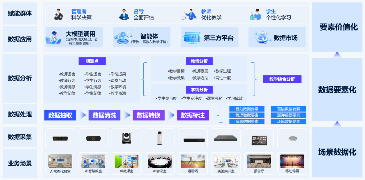 AI 課堂數(shù)據(jù)要素方案圍繞“場景數(shù)據(jù)化、數(shù)據(jù)要素化、要素價值化”三大核心展開。從業(yè)務場景出發(fā),通過數(shù)據(jù)采集、處理、分析與應用,賦能管理者科學決策、教師優(yōu)化教學、學生個性化學習以及督導全面評估,以數(shù)據(jù)要素驅動課堂發(fā)展。