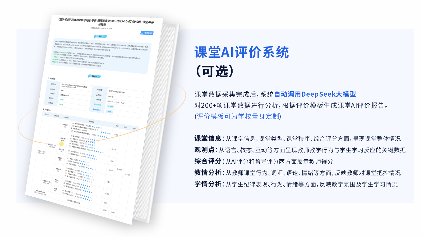 對200+項課堂數(shù)據(jù)進行分析,根據(jù)評價模板生成課堂AI評價報告。