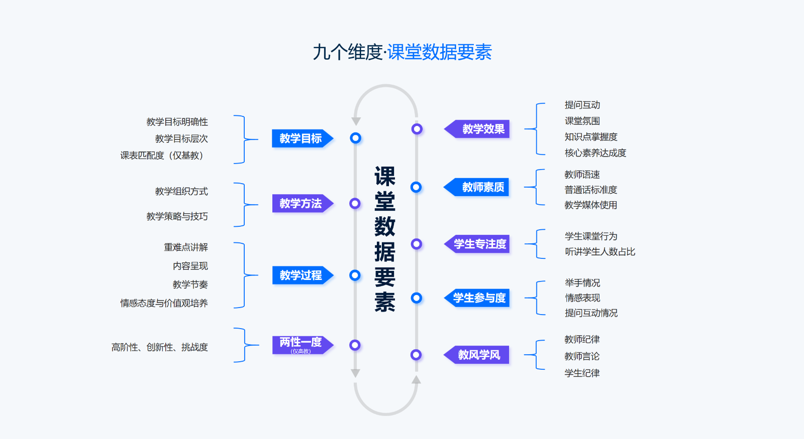 課堂數(shù)據(jù)要素采集細分為九大維度分析,涵蓋教學目標、方法、過程、兩性一度、教學效果、教師素質、教風學風、學生參與度與專注度等,輸出全面、客觀的課堂洞察。